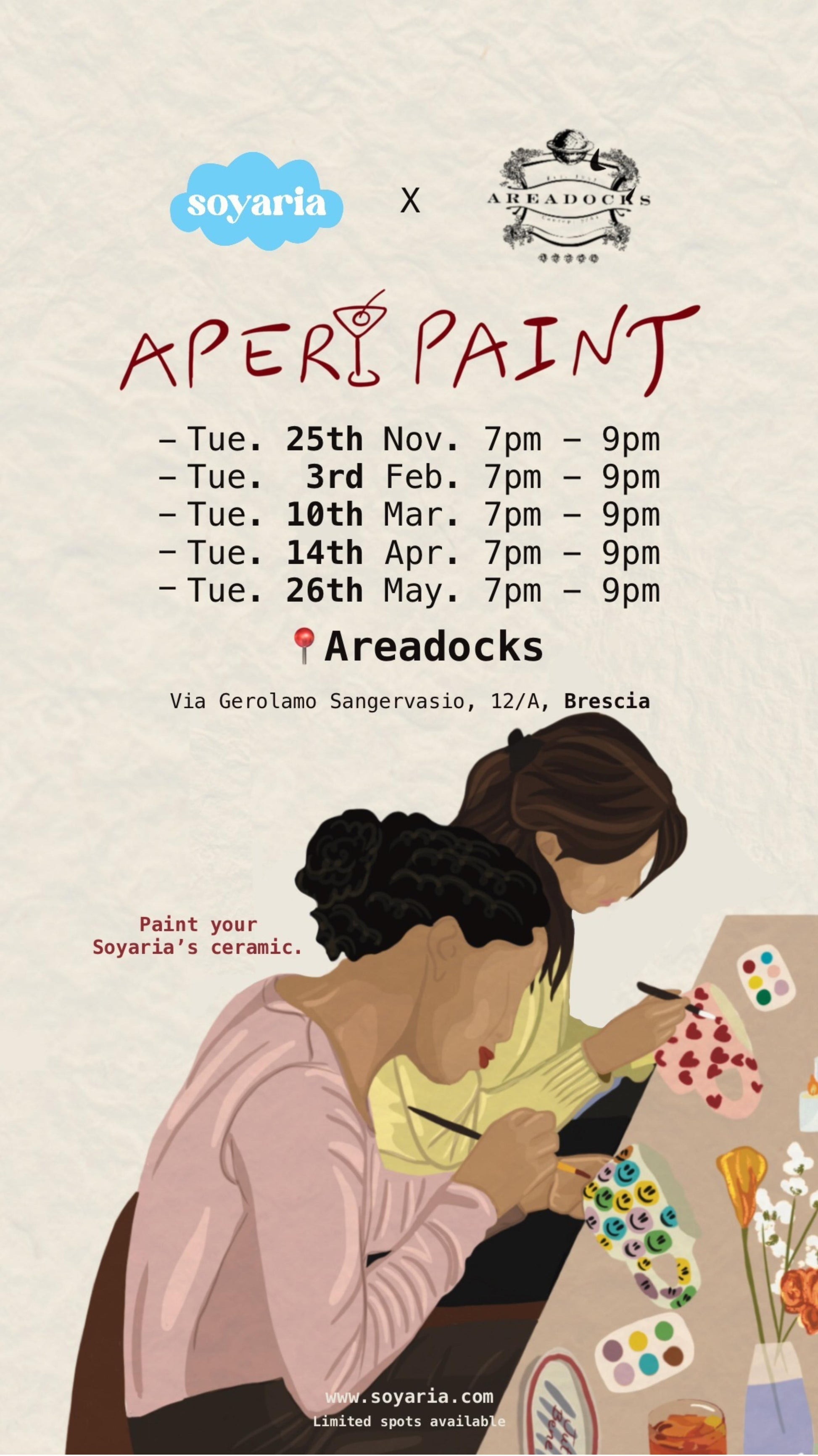 Decorerai il tuo pezzo fatto a mano da Soyaria, puoi scegliere di venire da sola o con amiche, in caso siate un gruppo si consiglia di avvisare per avere i posti vicino. Potrai scegliere se dipingere la tua tazza, oppure un piatto.