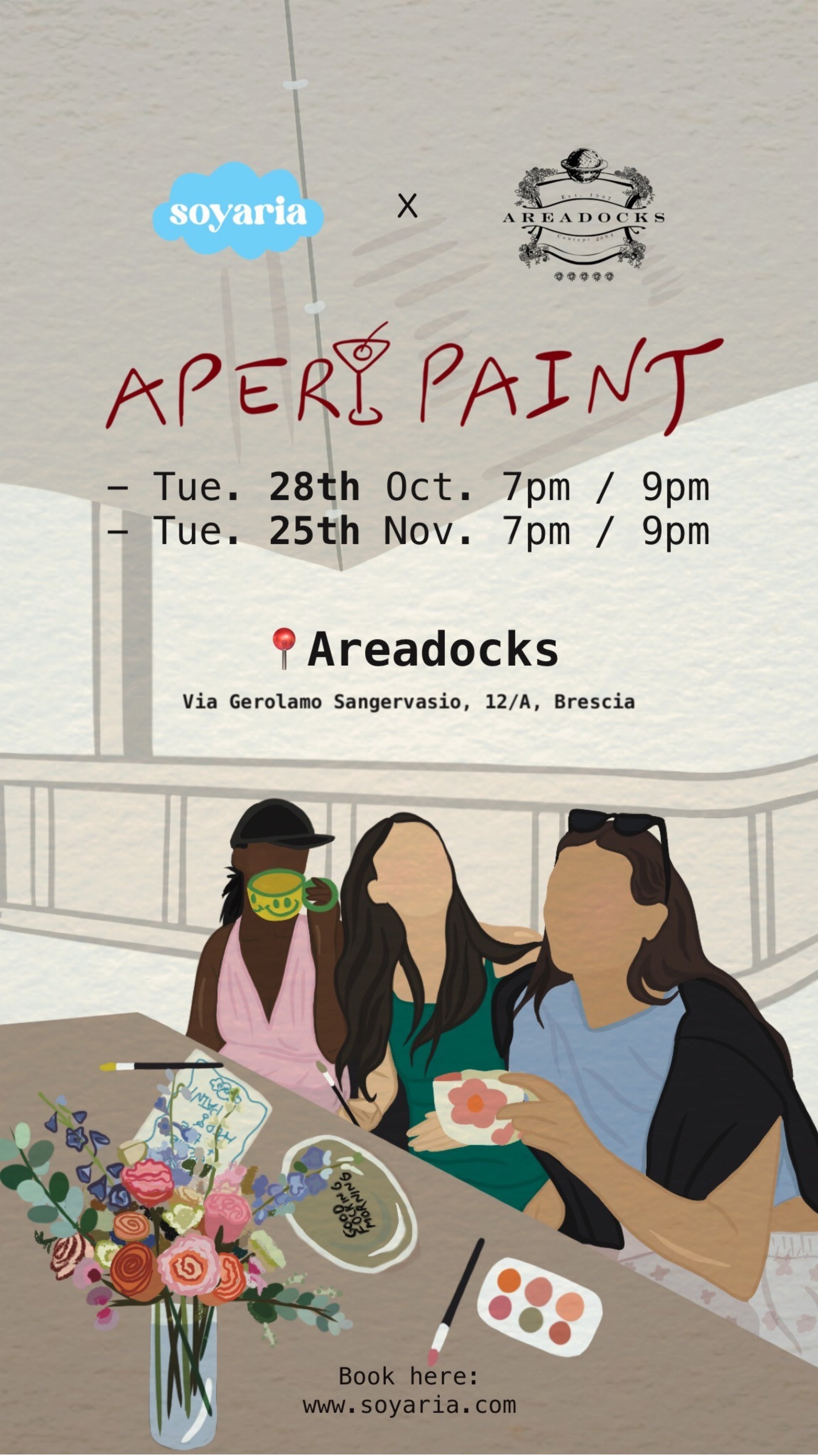 The price is 45 euros towards the workshop and 15 euros towards the aperitif to be paid on the day of the Aperi Paint. The buffet it’s mandatory in any case.