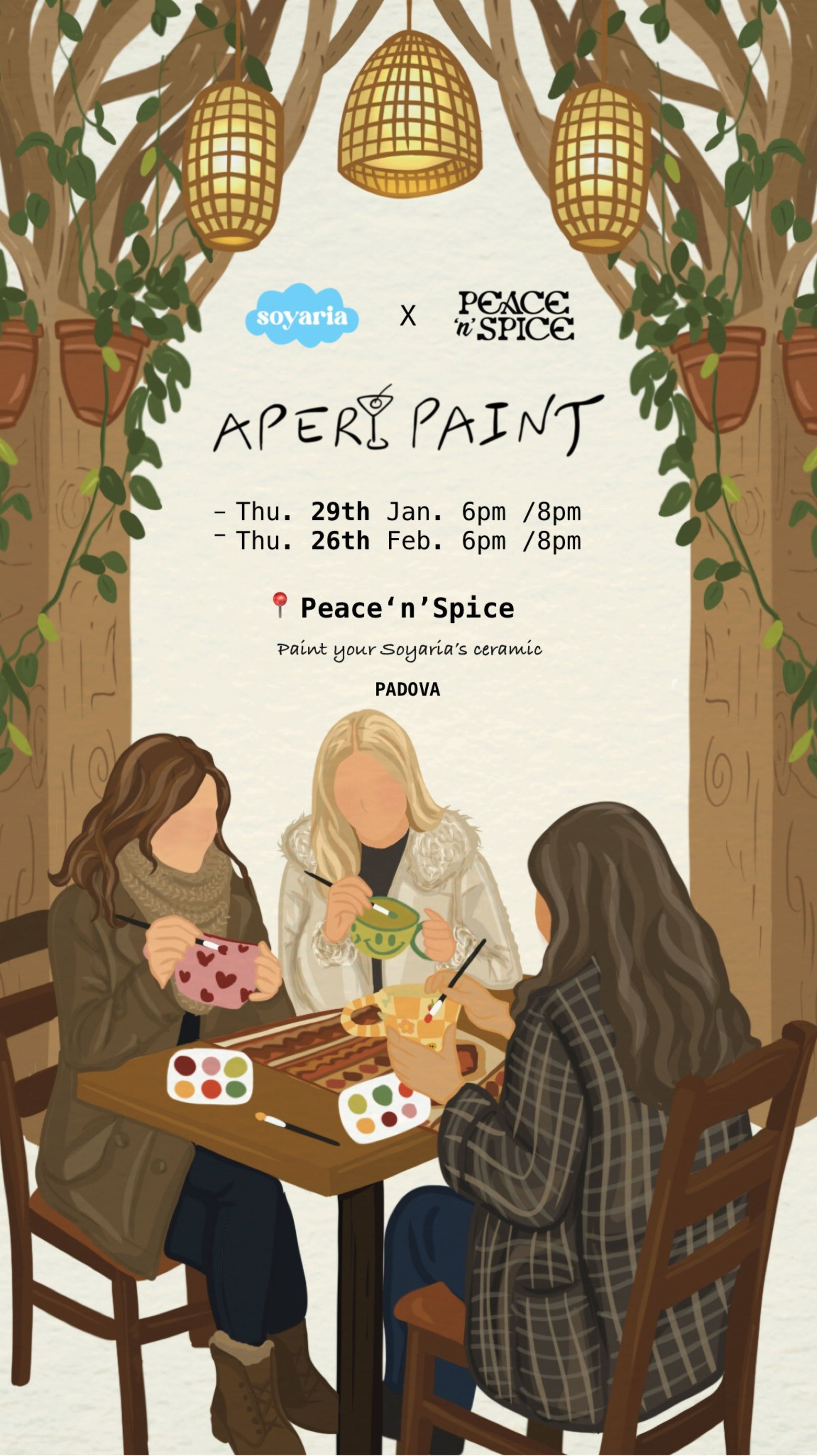 Il workshop si svolgerà in autonomia, seguendo le istruzioni su come dipingere. Si consiglia di leggere attentamente le istruzioni prima di iniziare. Puoi venire da sola o in compagnia, in caso siate un gruppo si consiglia di avvisare per avere i posti vicino.